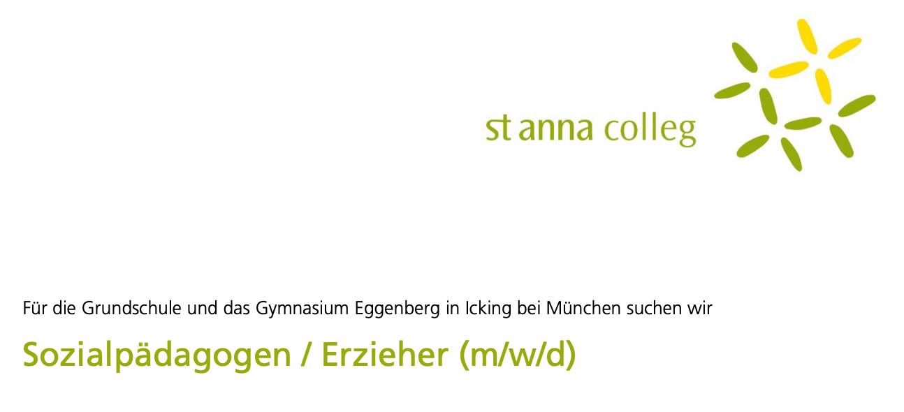 Sie sind Sozialpädagoge / Erzieher (m/w/d) und möchten an einer schön gelegenen Privatschule mit überschaubaren Klassen, farbenfroher Schulkleidung und sorgfältig ausgestalteten Räumlichkeiten tätig sein? Dann suchen wir Sie für unser Gymnasium oder unsere Grundschule Eggenberg in Icking bei München.